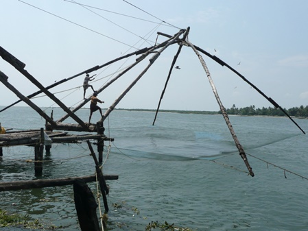 ... and the manually operated fish nets, that are lowered and raised by approx. five men ... here on the photo it just came out of the water and the few fish are caught by hand ...