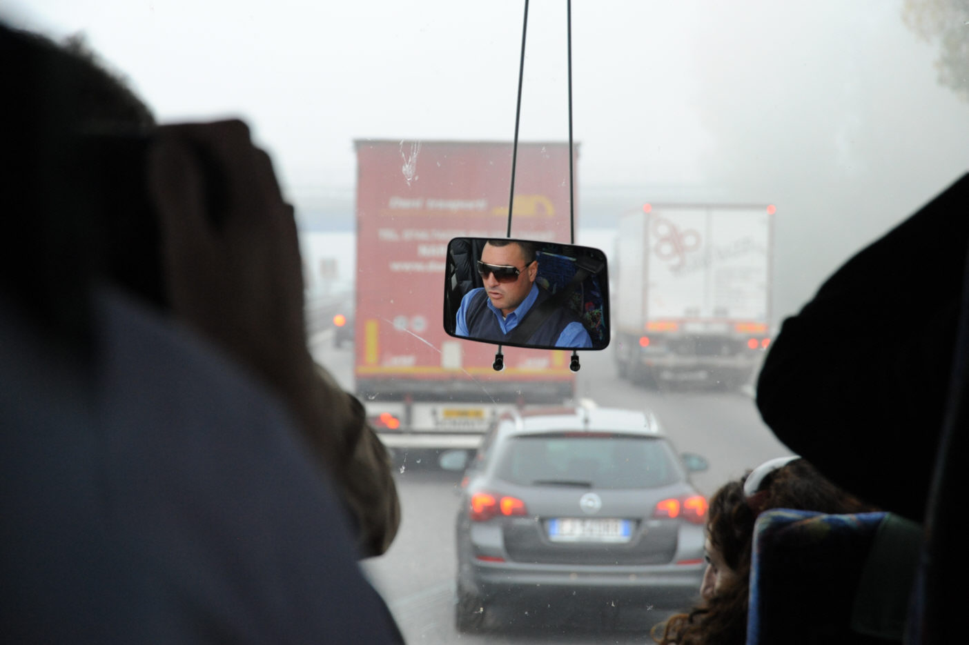 Leaving the airport of Milan, we jumped on the bus to Genua ... we had the usual Italian Ferrari driver ... my mum nearly vomited ... but we finally arrived there safely ... here the driver wearing sunglasses although it was totally foggy ... ;-)