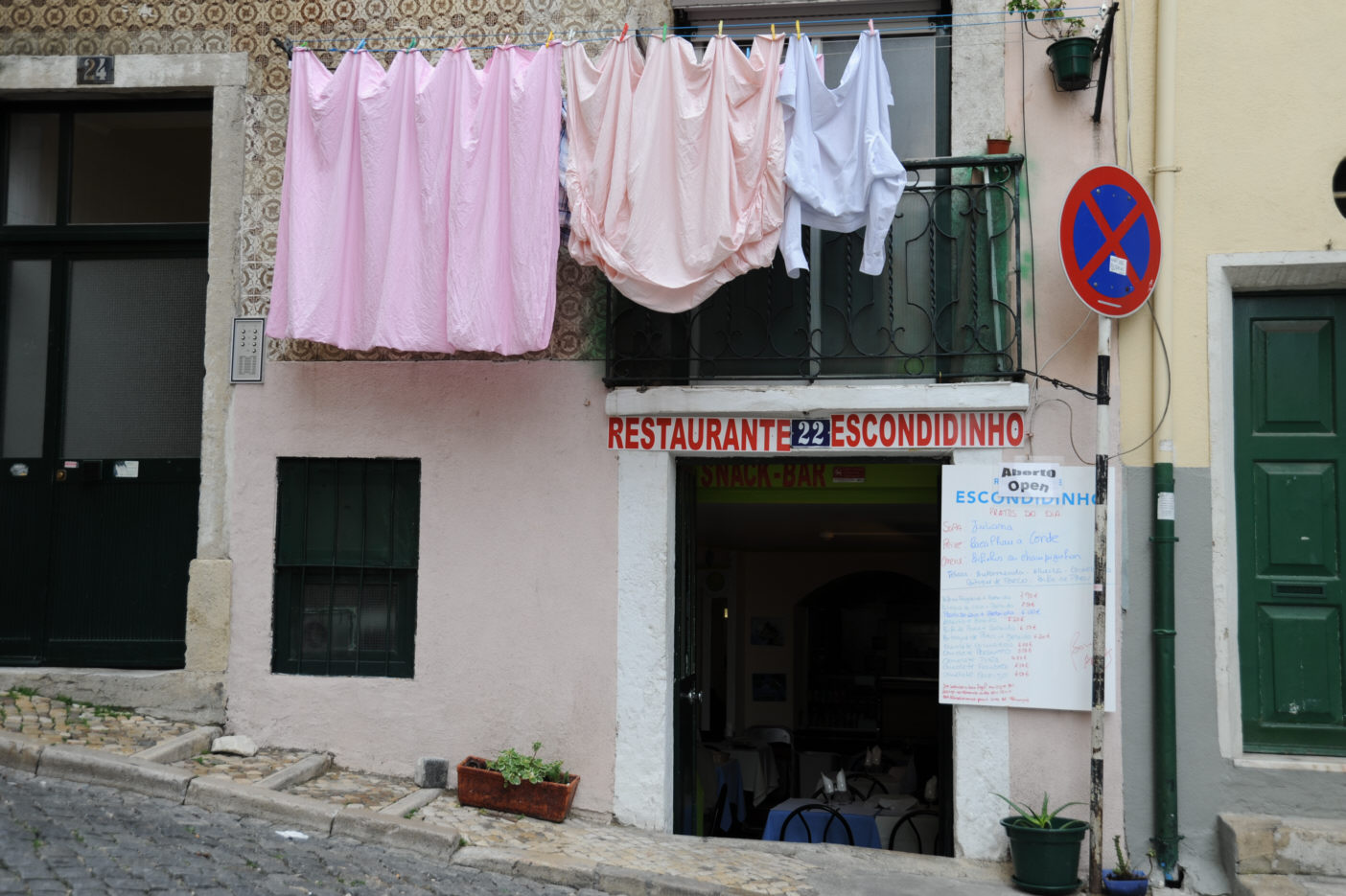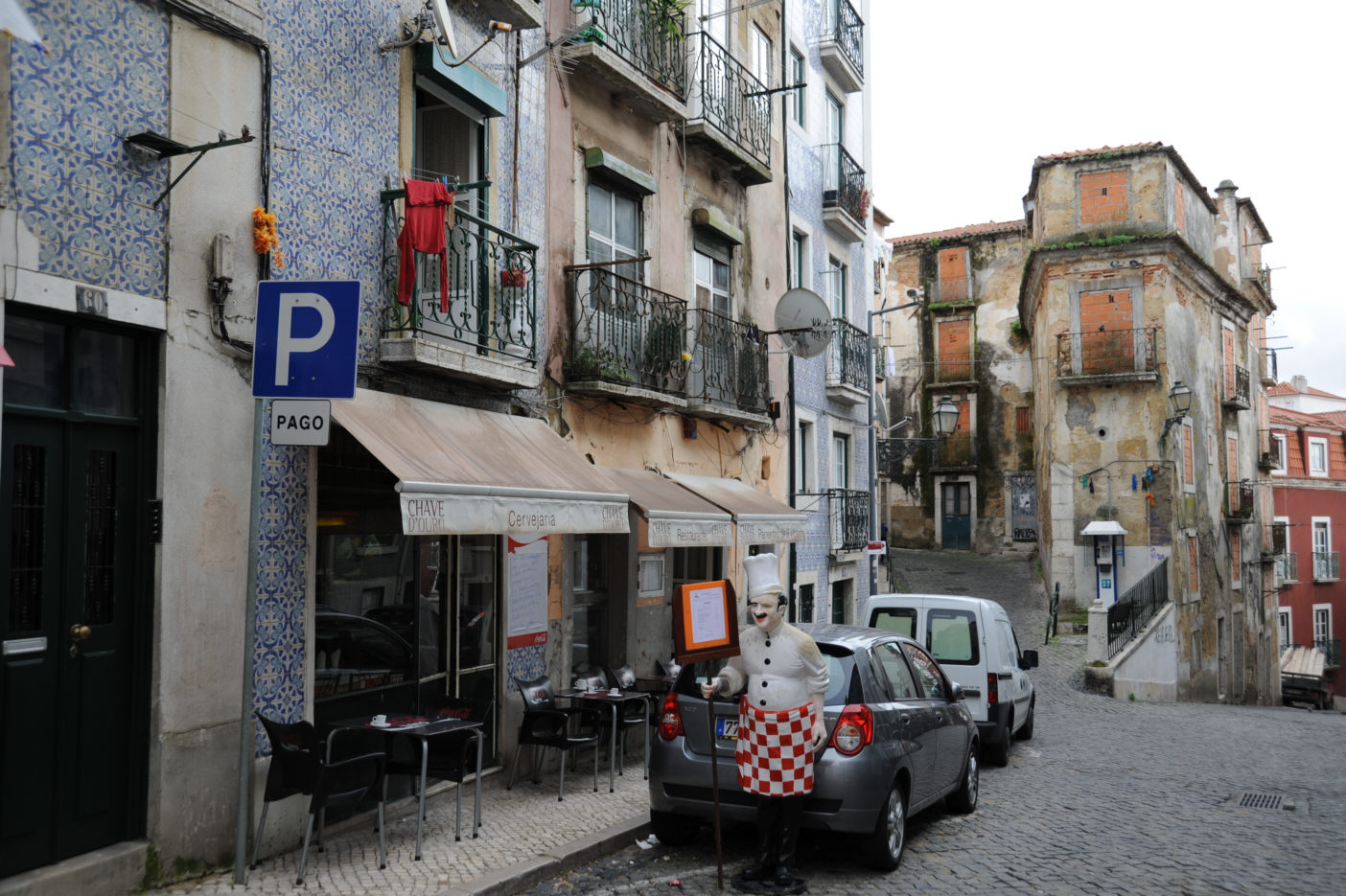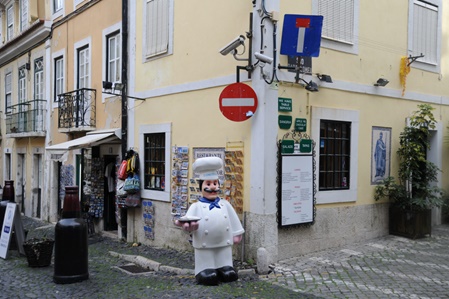 Here another typical corner of Lisbon ... restaurant, two cameras, five spotlights, two traffic signs ... which actually say: Turn Around!
