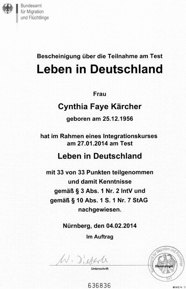 of the Integration Course "Life in Germany", where you had to learn everything about the political system, the different states, federal parliament, ... Cynthia achieved 33/33 points!